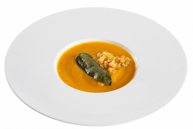 Яркая иллюстрация того, как тыква дружит с разными травами. На месте шалфея могут оказаться розмарин или базилик, тут как раз чем ярче аромат, тем интереснее получится суп.