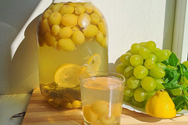 Виноград при варке дает, как правило, сладость. Его природная кислинка таится где-то на задворках. И потому этой ягоде стоит помочь, добавив в компот лимон. А еще мы добавили листья мяты — получился еще один родственник мохито.