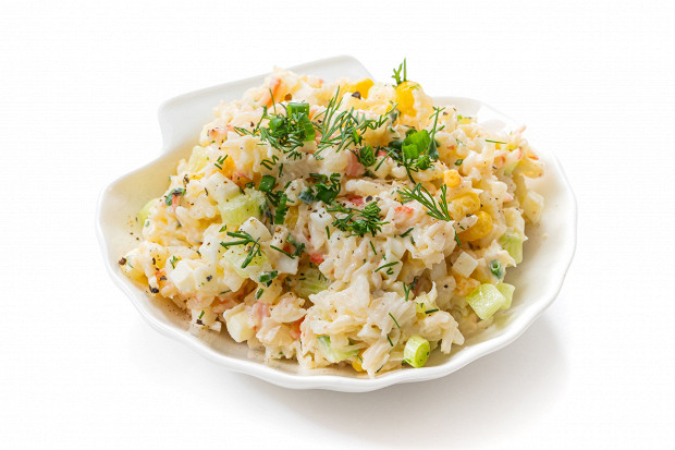 Все как в лучших домах: крабовые палочки, яйца, кукуруза, лук, рис, майонез. И укроп — как главная русская специя.