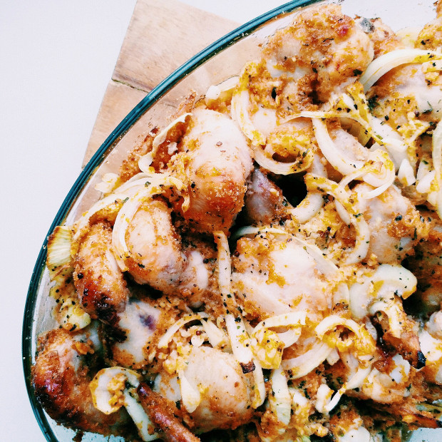 Крылья надо обвалять в чесночной панировочной смеси, а затем запечь в духовке под маринадом, в состав которого также входит чеснок, только уже не сухой, а свежий. Есть советуют со свежим луком.