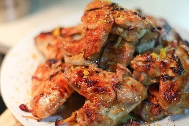 Крылья пропитываются лимонным сиропом, отчего куриная плоть становится еще нежнее, а само блюдо отдаленно напоминает даже десерт.