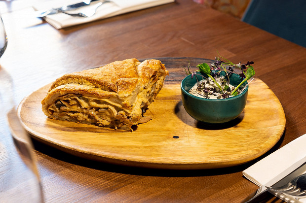 Семейный рецепт шеф-повара Андрея Колодяжного, такой курник готовила ему в детстве бабушка. В начинку идет куриная грудка, которой сливки и сливочное масло добавляет нежность и густоту, а белые грибы — аромата. Пирог из девяти (!) слоев, между слоями начинки — блины, обильно смазанные сливочным маслом, а вся конструкция обернута в слоеное тесто.