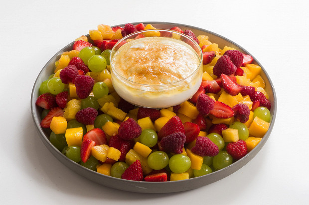 Нарядный образец, такому место не только за завтраком, но и на именинном столе. Пестрый микс из ярких фруктов (успейте приготовить его в сезон клубники) и нежная йогуртово-медовая заправка, которая подается отдельно.