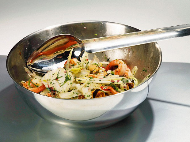 Родственник укропа, фенхель в европейской гастрономической иерархии представляет собой примерно то же, что и хомо сапиенс в сравнении с неандертальцем на лестнице эволюции. Фенхель в отличие от укропа имеет анисовый привкус и запах, а также хрустящее овощное мясо. Он идеально сочетается с морской кухней — хоть с печеной рыбой, хоть с жареными креветками. Вместо или вместе с лимоном можно использовать лайм. Кроме креветок и мидий в салате могут появляться и кальмары, и осьминоги, раки и прочая морская гадость.