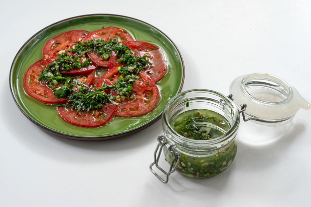 Пока помидоры в самом соку, этим надо непременно воспользоваться. Можно просто заправить их хорошим подсолнечным маслом «с семечкой». Но если есть немного времени, приготовьте восточную пряную салатную заправку. В ней не только целый букет специй, но и немного сливочного масла, которое здорово с помидорами сочетается, обволакивая ароматом пряностей каждый ломтик. Можно обойтись одними томатами, нарезав их кружками и выложив на тарелку, как карпаччо. Но не стоит себя ограничивать — тот же соус отлично подойдет и к обжаренной молодой капусте, и к любому салату с участием зеленой фасоли вроде нисуаза.