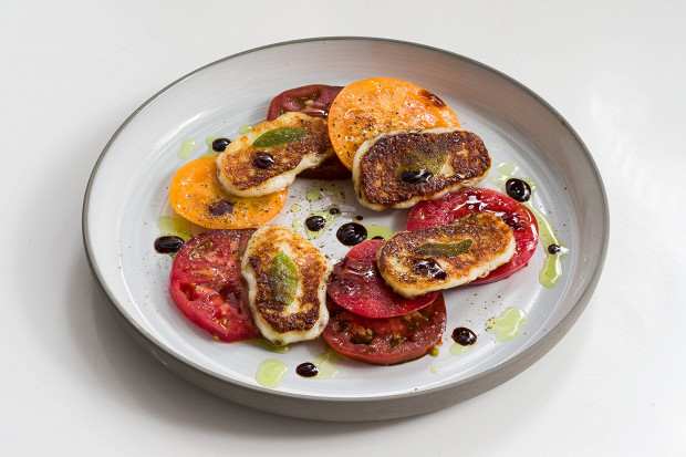 Кипрский сыр с плотной, слегка резиновой мякотью просто создан для гриля. Найти халуми в Москве не проблема — его давно научились добротно делать и у нас. А вот разыскать в продаже свежий шалфей — тот еще квест: в основном продается другой, сушеный, который пахнет аптекой. Свежие же, пушистые листочки лишены лекарственного запаха, а имеют легкий пряный аромат. Его мы и использовали, собрав букет из помидоров, жареного сыра с отпечатавшимися на нем листочками шалфея, и заправили зеленым маслом из собранных на огороде «Еды» ароматных трав.