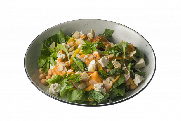 Тьма ингредиентов, есть среди них и абрикосы — им предстоит превратиться в соус и залить собой нут, перец, редиску и фету.