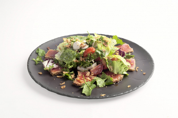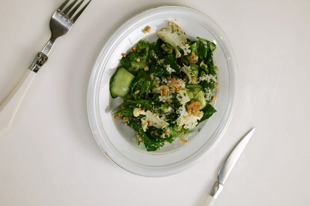 Цветная капуста, авокадо и огурцы, в изобилии обложенные салатными листьями и приправленные соусом шисо. Придуман шефом Константином Борисовым из гастропаба «Крылышко или ножка».