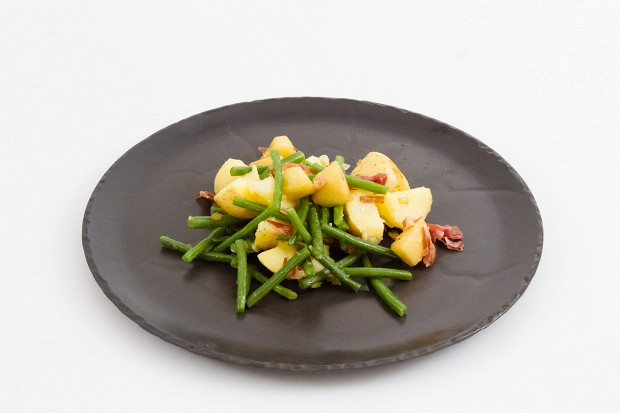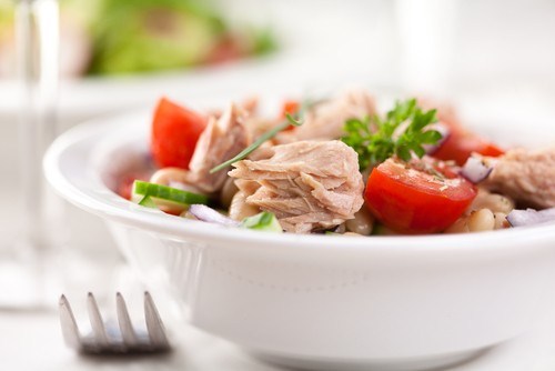 Проще простого — консервированная фасоль, консервированный тунец и спелые помидоры. Этот салат важно подавать холодным.