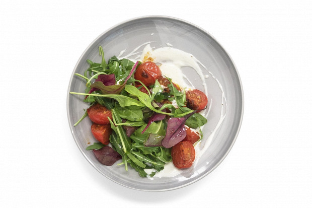 Приготовить это возможно только летом, когда любые помидоры — хороши. К салату прилагается запеченная в духовке и поломанная на куски чиабатта.