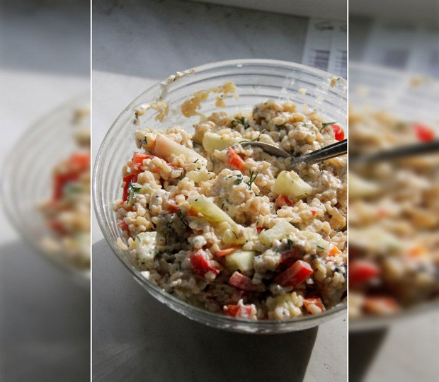 Булгур — отличная основа для салата, в который в противовес крупе тут же хочется положить массу всего свежего, в том числе и свежий огурец.