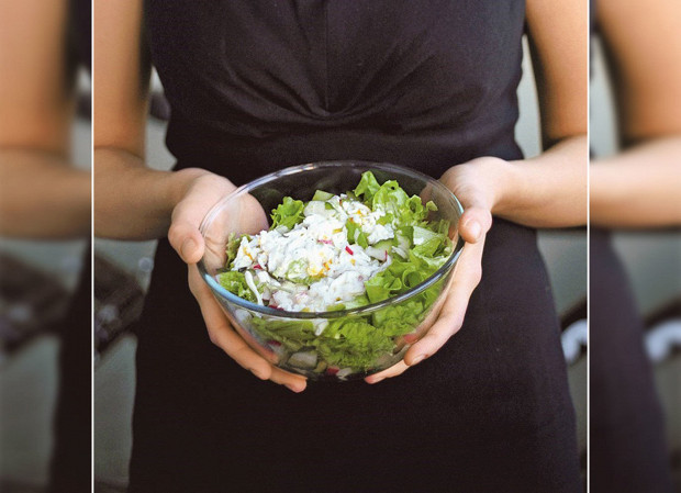 Почти вышеупомянутый салат «Весенний», только вместо укропа и лука понадобится листовой салат, а яйцо требует отдельных манипуляций.