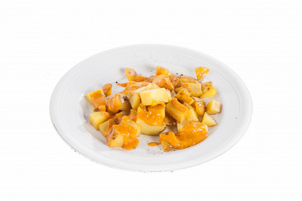 Важная для Испании закуска под алкоголь: недоваренная картошка крепко обжаривается на сковороде и подается с острым густым соусом. Кусочки картошки должны быть небольшими, чтобы легко помещались во рту.