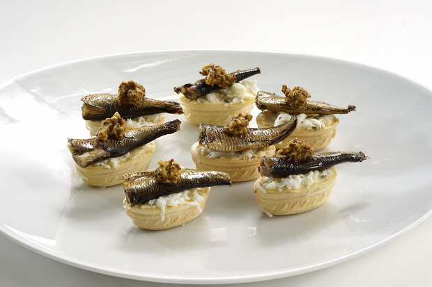 В банке или хрустальной селедочнице, ставить на стол шпроты в новогоднюю ночь — традиция еще с советских времен, от которой не стоит отказываться, надо лишь слегка поработать над сюжетом. Сочетание простейших продуктов может быть настолько эффектным, что шпроты внезапно превращаются из куколки в бабочку (в кулинарном, конечно, смысле): в этой начинке присущий даже качественным шпротам привкус копченой резины смягчается сырно-яичным салатом, а маринованные огурчики окончательно от него избавляют.
