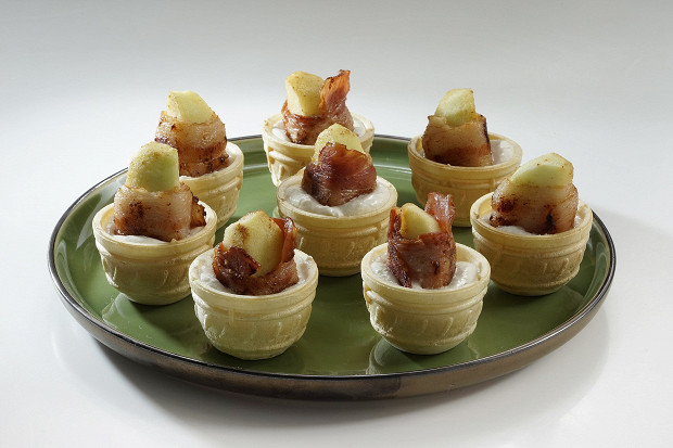 Сочетание сладких фруктов и мяса всегда рождает в закусках интригу, но дымный след копченого бекона придает ему новую глубину. Фокус в том, чтобы дольки яблока завернуть в ломтики бекона и в таком виде обжарить, они спекаются вместе и получается красота: сверху — румяная лоснящаяся беконная корка, а внизу — превратившаяся в полупюре яблочная долька, пропитавшаяся ароматом копчености.