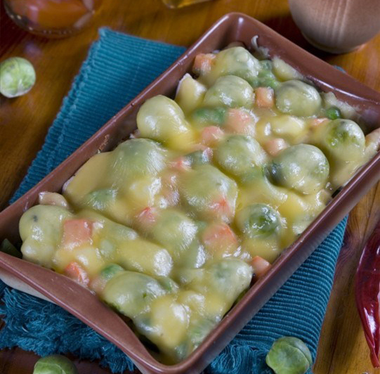 Брюссельская капуста очень не любит варку, а страсть как любит запекание или паровой режим — плоть ее остается живой, но только нежнее прежнего. Соус может состоять из любых сыров, капуста примет любой вкус.
