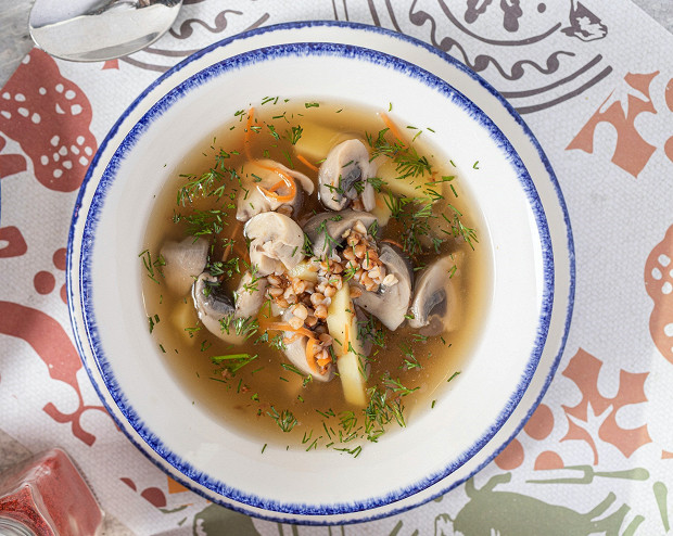 Главный секрет немудреного супа — готовить его в сезон и использовать хорошие лесные грибы. В бульон можно класть подберезовики или подосиновики — они дадут навар, но обязательно добавьте хотя бы один боровик, исключительно для аромата. В остальном простая домашняя еда и должна быть такой лаконичной: зажаренная с луком морковь, гречка и укроп. И никакого чеснока и, упаси боже, горчицы и хрена — натуральный тонкий грибной дух хорош сам по себе, лучше оставить его без посторонних. Рецепт от Русико Шаматавы, шеф-повара ресторанов «Джонджоли».