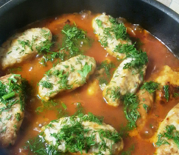 За главную в этих котлетках курица, а небольшому количеству предварительно отваренной гречки отводится та же роль, что в обычных котлетах хлебному мякишу: она разрыхляет фарш, не давая котлетам лечь слежавшимся комом, и добавляет им пышности, которую курица сама по себе, особенно куриная грудка, продемонстрировать способна не всегда. Еще один недостаток обычных куриных котлет: при повторном разогреве они часто становятся жесткими, тут решается при помощи густого томатного соуса. В нем котлеты не только набираются сока при тушении, в нем же их можно сохранить и снова разогреть, вкус на следующий день станет даже более насыщенным за счет специй и помидорной кислинки и сладости.
