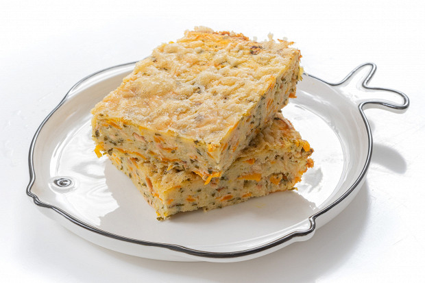 Неожиданное, но приятное сближение: сама по себе копченая рыба слегка горчит, а нейтральная вязкость творога эту горчинку подчистую убирает, оставляя запеканке легкую соленость и аромат дымка. В роли освежителя и подсластителя — аккуратная доза тертой моркови. Она же придает запеканке соблазнительный лососевый оттенок, даже если внутрь добавлена рыба попроще.