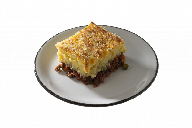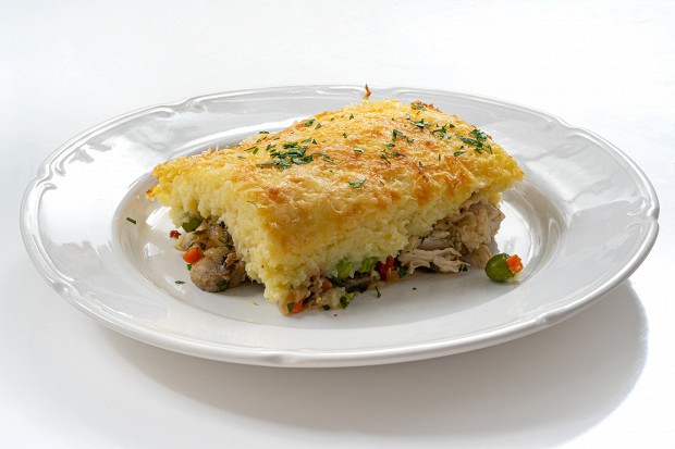 Рецепт элементарный, как из школьной столовой: куриное филе с обжаренными шампиньонами, луком и морковкой идет в начинку вместе с зеленым горошком, все это прячется под толстую подушку картофельного пюре. Но стоит капнуть в картошку немного трюфельного масла — и оно мгновенно оживит своим терпким ароматом эту добротную, но скучноватую смесь. А тонкая зажаристая корочка из пармезана сделает детской запеканке ресторанный тюнинг.