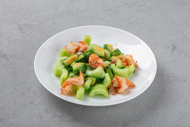 Лучшие друзья девушек — не только бриллианты, но и креветки. Калорий в них всего ничего (меньше одной калории на грамм — да это практически фитнес-меню), а любому вороху зеленых листьев они придают торжественный вид. Вдобавок этот салат будто специально собран для тех особ, кто ближе к весне вступает в битву с лишними килограммами (иными словами — для всех девушек без исключения) — тут и авокадо как поставщик полезных омега-кислот, и легкая заправка из оливкового масла, и сельдерей, главный герой оздоровительных смузи. И при этом снайперски выверенный вкус, который посетителям ресторанов «Кофемания», откуда мы взяли этот рецепт, не приедается уже много лет.