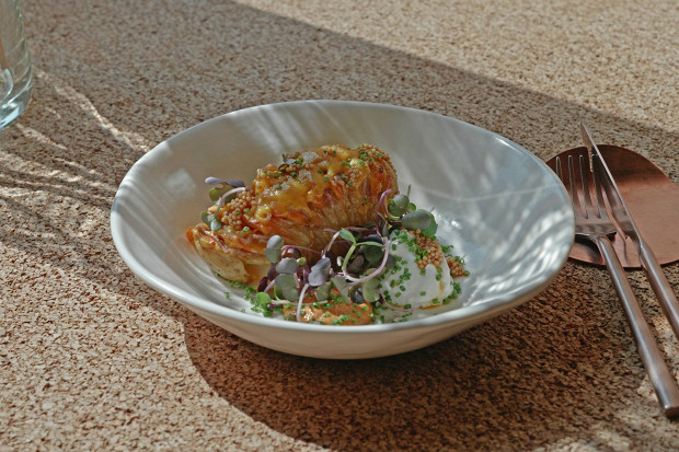 Хассельбак — шведское изобретение. Идея в том, чтобы подавать простые продукты вроде картошки, сельдерея или тыквы так, чтобы они выглядели максимально празднично. Для этого клубень или любой другой овощ подходящей плотности и размера эффектно нарезают гармошкой и вкладывают в эти разрезы начинку. Версия начинки от Михаила Курохтина, шеф-повара ресторана Midsummer, — говяжий бекон и копченый чеддер. Но в картошку-гармошку можно вложить, например, ломтики тамбовского окорока или копченого угря, а если хотите получить сугубо вегетарианское блюдо — то жареные баклажаны.
