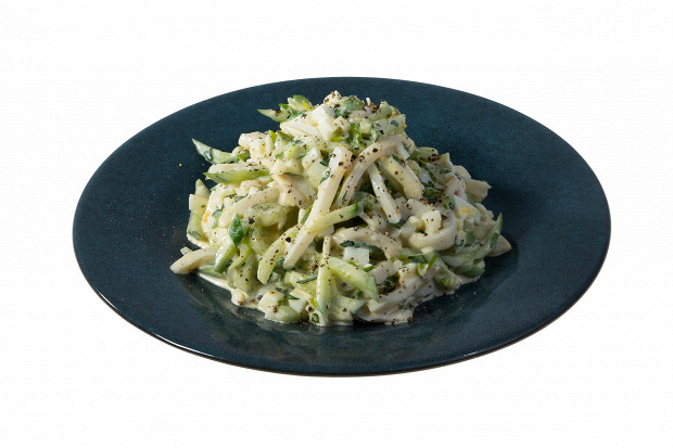 Присутствие салата с кальмаром на новогоднем столе привносит торжественную ноту. Потому что кальмар — он хоть и вполне доступный, но деликатес. Важно только добиться от него нежности. Практика показывает, что лучше покупать целиковую тушку, а не кота в мешке, то есть куски кальмара в банке. Перед приготовлением нужно переложить кальмара из морозилки в холодильник — пусть размораживается как можно медленнее, если сделать это быстро, морское мясо потеряет структуру. Оптимальное время приготовления кальмара — около пяти минут в зависимости от размера. Важно его не переварить, иначе он потеряет влагу и станет резиновым.