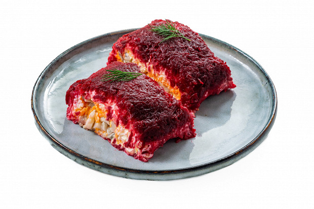 Еще один старинный салат на новый лад. Порционные рулеты из селедки под шубой удобнее традиционной подачи на блюде слоями. Во-первых, их удобнее класть на тарелку, во-вторых, меньше шансов, что в красных свекольных пятнах будет вся парадная скатерть. Если же Новый год вы празднуете дружеской компанией вскладчину, когда каждый приносит свое блюдо, то рулет в контейнере гораздо удобнее в транспортировке, чем селедка на блюде.