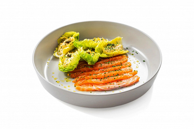 Этот рецепт мы взяли у шеф-повара ресторана-брассери «Кузнецкий Мост» Игоря Корнева. По своей сути перед вами не что иное, как салат «Мимоза», но только разобранный на кирпичики, пересобранный и перепридуманный. Нежный яичный крем выложен на хрустящие листья салата, малосольная рыба подается отдельно, заправка очень интересная, с участием каперсов. Так без лишних усилий и сложных ингредиентов поднадоевший салат превращается в закуску ресторанного уровня. Внутри этого рецепта вы к тому же найдете вставной сюжет — а именно подробный рассказ шефа, как засолить лосося для праздничного стола. Способ очень удачный, рыба получается не слишком соленой, в меру пикантной, пропорции соли, сахара и специй рассчитаны шефом до грамма.