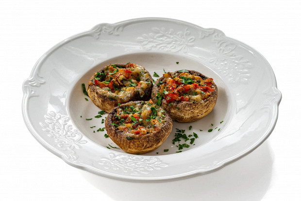 Горячая закуска, которая не станет хуже, даже если простоит на столе полночи. Фаршированные грибы любят все, к тому же их удобно есть руками, хватая за шляпки. Начинка несложная, но очень эффектная: красные помидоры, белоснежная моцарелла, зеленые всполохи петрушки. Если за столом окажутся те, кто мяса не ест, для них запеченные шампиньоны могут стать отличной заменой мясному горячему блюду.
