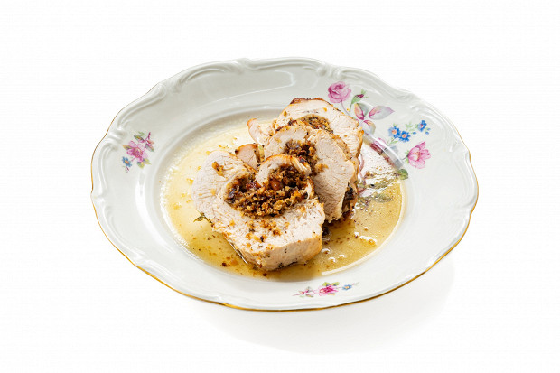 Рождественский стол всегда изобиловал мясными закусками, и в основном это было мясо, запеченное большим куском, или буженина. Это мог быть и свиной окорок, и шея, и хороший кусок грудинки. У индейки в этом смысле есть преимущества: буженина из нее получается достаточно постной, но при этом это белое мясо отлично раскрывает свой вкус в присутствии орехов, сухофруктов и специй. Индейка с фисташками выглядит нарядно и будет украшением стола как в виде горячего блюда, так и холодной, в составе мясной тарелки. Если вы считаете фисташки не совсем каноническими, то их смело можно заменить фундуком.