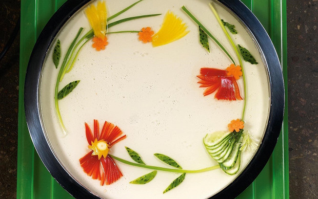 Узоры из овощей и фруктов на молочном желе — часть обязательной программы в поварской школе Le Cordon Bleu. Все эти красоты предназначены не для того, чтобы их есть, а для того, чтобы подавать на них желе. И любоваться. Для этого панно мы использовали красный и желтый болгарский перец, огурец, зеленый лук, морковь и лимон.