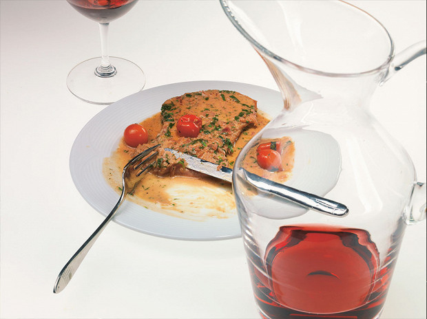 Соус к телятине по консистенции должен быть сильно жиже майонеза, но слегка гуще жирного крем-супа. Соус сам по себе тянет на гарнир, но можно и усилить удельный вес углеводов в этом блюде, подав его с картофельным пюре. Помидоры для соуса надо предварительно очистить от кожицы или использовать уже очищенные, из банки. Лучше итальянские — pelatti, что означает «без кожицы». Помидоры добавляют соусу кислинку и колер; сильно вмешивать их не нужно, чтобы не портить форму.