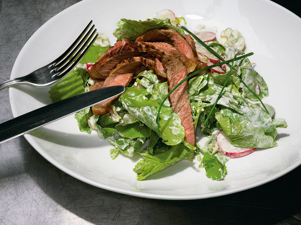 Для этого салата лучше использовать стейк рибай — с прожилками жира: это мясо после обжарки сочнее и вкуснее обычного постного филе.
