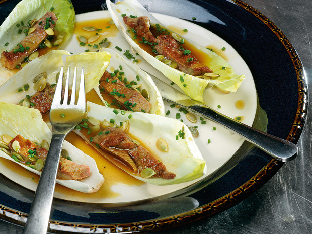 Вилки — необязательный элемент. Удобнее всего есть печенку с цикорием, беря ее руками.