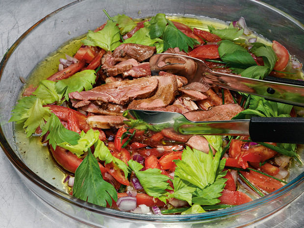 Говядина с томатами, базиликовым маслом и листьями сельдерея