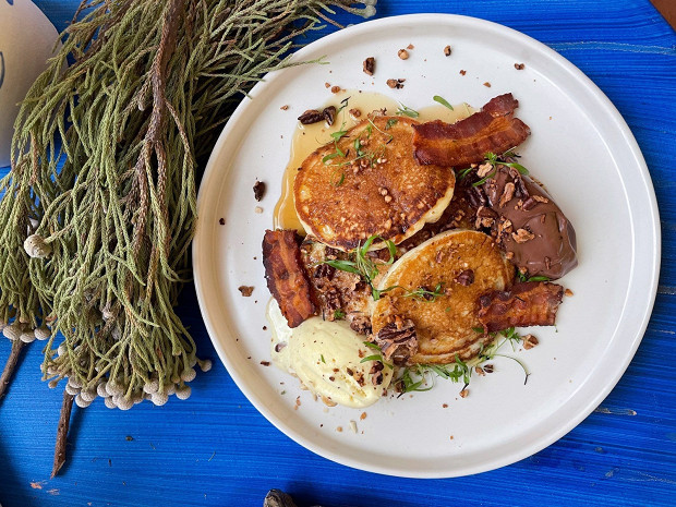 Самый сложносочиненный рецепт в этой подборке — для тех, у кого есть стремление к вау-эффекту. Хотя на деле все просто. Оладьи на кефире выпекаются по классическому рецепту, дело только за антуражем. Чипсы из бекона готовятся на противне за 10–15 минут. Ганаш потребует примерно часа времени, из которых 50 минут он проведет, охлаждаясь в холодильнике. Рецепт от Максима Фоменкова, шеф-повара ресторана «Узоры».
