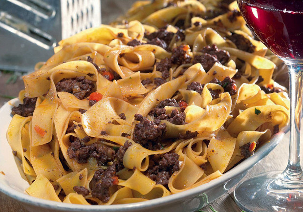 говядина. В роли пасты — все что угодно, от спагетти до фарфалле. Но лучше всего к болоньезе подходят широкие тальятелле, паппарделле, феттучини.