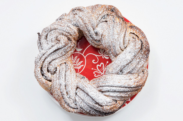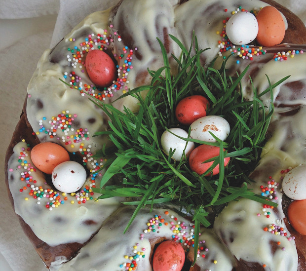 Это и выпечка, и столовый декор — пасхальный венок пекут специально, чтобы использовать как подставку под крашеные яйца. Но от этого сама выпечка менее вкусной не становится: это легкое, хорошо подошедшее тесто, нашпигованное изюмом и орехами. Времени, чтобы дрожжи сделали свое тестоподъемное дело, понадобится достаточно, поэтому рассчитывайте время: если хотите успеть сплести венок к пасхальному столу, ставьте тесто в субботу.
