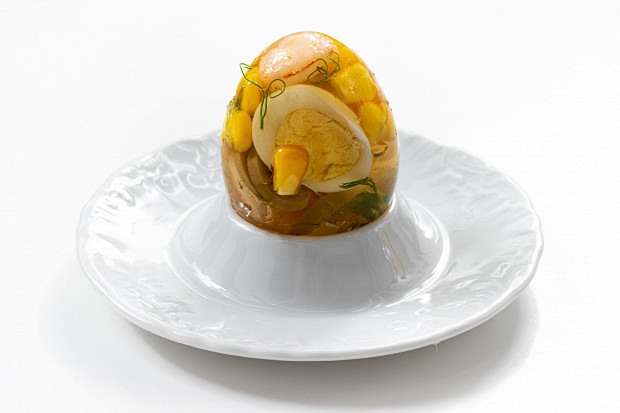 Еще одна фантазия на тему традиционного пасхального яйца — роскошное заливное с морепродуктами. Выглядит не хуже, чем яйца Фаберже, но в отличие от крутых яиц, которые скрываются за ярко раскрашенными скорлупками, проглотить его в любом количестве ничуть не затруднительно. Готовых форм это заливное не требует — сгодятся обычные яичные скорлупки. И если добавите внутрь какие-нибудь желтые ингредиенты (например, кукурузу или яичный желток), а в бульон — щепотку куркумы или шафрана, то яйцо получится не простое, а золотое.