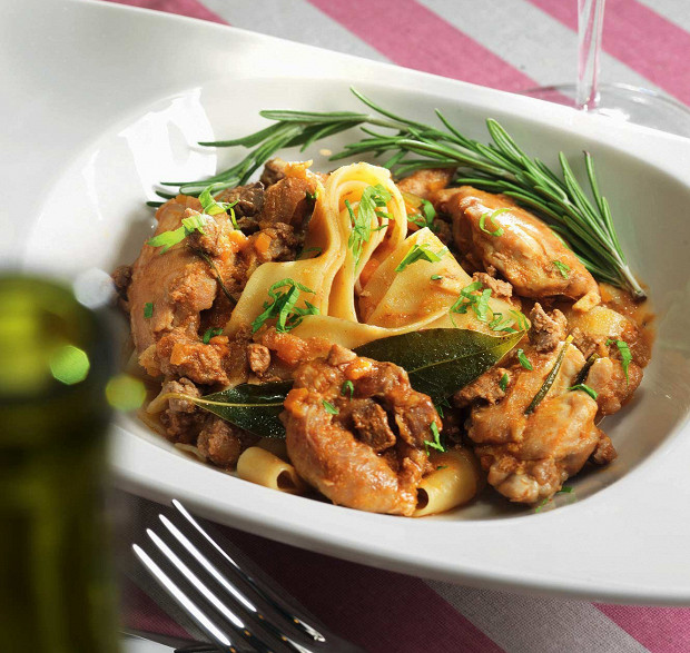 Кролик в Пасху хорош не только на поздравительной открытке, но и в виде рагу. Тут важно знать один секрет: для сохранения сочности и достижения мягкости его довольно упорную тушку лучше всего готовить в два этапа: сначала быстро обжарить в масле, а потом основательно потомить в вине и овощах.