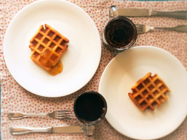 Вариация на тему толстых бельгийских вафель, подходящая для вегетарианцев и тех, кто держит пост. Смесь пшеничной, овсяной муки доводится до нужной консистенции миндальным молоком и соевым йогуртом. Льняная мука играет роль яиц — она достаточно клейкая, чтобы не дать вафлям развалиться. Без глютена же, увы, обойтись не удастся — иначе разрыхлитель не сделает свою работу, и тесто не поднимется. Вкуснее всего подавать такие вафли с бананом или медом. Или с вареньем — но без всяких животных жиров.