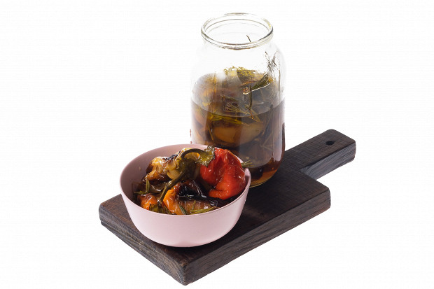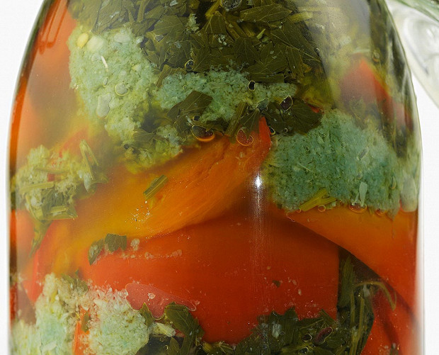 - Держите перец в кипящем масле минут 5, пока его внутренняя часть не станет мягкой и не будет легко поддаваться нажатию ложки. Выложите перцами первый слой в литровой банке. Затем в кипящее масло опустите мелконарезанную петрушку (как и перец, в дуршлаге), чтобы она уварилась. Как только масло заберет цвет петрушки и станет зеленым, петрушку переложите в банку поверх перца и следом опустите в кипящее масло в дуршлаге чеснок. Как только он уварится и отдаст цвет, достаньте его из дуршлага и уложите в банку еще одним слоем.