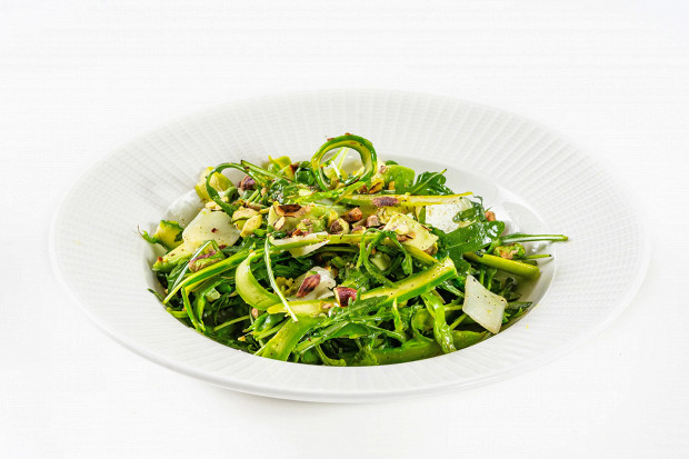 Молодая спаржа хороша тем, что ее можно есть даже сырой. Если спаржевая стрела в ваших руках сломалась, не переживайте, а радуйтесь — она свежая. Но даже и у этой нужно безжалостно отрезать нижние сантиметров пять — они слишком твердые. Дальше превращенная в ленточки свежая спаржа может стать полноправной участницей любых зеленых салатом. Например, вот такого, где ей ассистируют хрустящие фисташки, аккуратная горчинка руколы, кремовая мякоть авокадо, хорошо оттеняющая бодрый хруст и фисташек, и спаржи, а также медовый соус винегрет, соединяющий все в аппетитное целое.