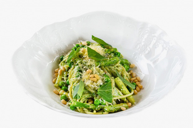 Рецепт из серии «какое все зеленое, какое все красивое». Кроме спаржи, в нем участвуют еще и зеленый горошек, а также сливки и пармезан (тут нужно взять лучший пармезан, который себе можете позволить, — без него не будет гармонии вкуса). Самое важное — и пасту, и зеленые овощи отварить точно до состояния альденте. В спагетти должна чувствоваться упругость и при жевании — внутренний стержень, а спаржа и горошек должны быть полуготовы — стать слегка мягче, но при этом хрустеть.
