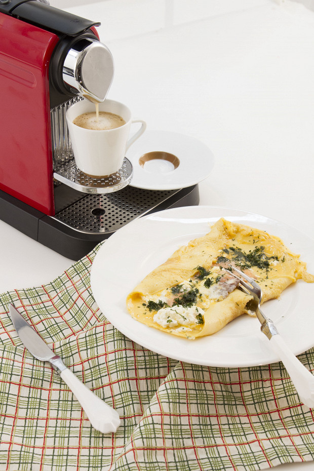 Взбивать такой омлет лучше обыкновенной вилкой, а не венчиком. Венчик делает текстуру слишком гомогенной, а здесь неплохо сохранить хотя бы намек на характер отдельно взятых белка и желтка. Солить этот омлет не стоит. Ее даже в слабосоленом лососе вполне достаточно.