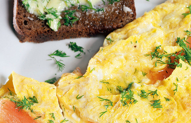 Главное в этом омлете — не пережарить лосося. И не переборщить с водкой.