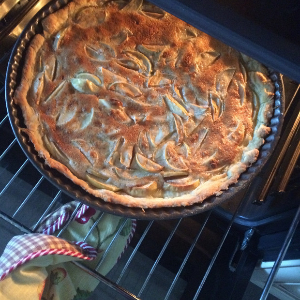 Говорят, что такой пирог из антоновки готовили сестры Цветаевы. По сути, это привычная нам всем шарлотка со сметаной.