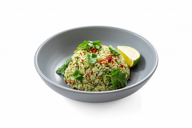 Во-первых, тут нужно использовать жасминовый рис: он сам по себе очень вкусный. Во-вторых, дополнительных вкусов ему придаст целая охапка ингредиентов: оливковое масло, кинза со шпинатом (они же еще добавят и красок), перец чили и белый лук с чесноком, лайм и сахар с солью. Отличная получается еда, которую, как табуле, можно есть горячей и холодной.