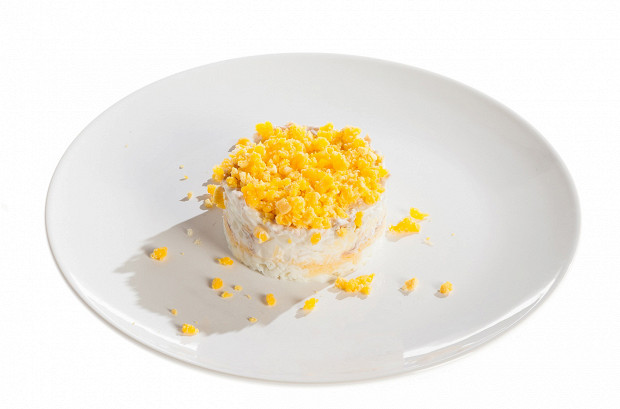 Парадоксально, но название у этого праздничного и вполне новогоднего салата отсылает к первым весенним цветам — цветкам мимозы, осыпавшимся на снег. Роль последних играет яичный белок, а цветки получаются из покрошенных желтков. Для салата понадобится майонез, и, если сделать его самостоятельно, получится еще вкуснее.